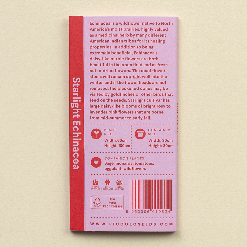 The purple coneflower, commonly named Echinacea, is a wildflower native to North America’s moist prairies. It is highly valued as a medicinal herb by many different American Indian tribes for its healing properties. In addition to being extremely beneficial, Echinacea’s daisy-like purple flowers are both beautiful in the open field and as fresh cut or dried flowers. The dead flower stems will remain upright well into the winter, and if the flower heads are not removed, the blackened cones may be visited by goldfinches or other birds that feed on the seeds. Starlight cultivar has large daisy-like blooms of bright rosy to lavender pink flowers that are borne from mid-summer to early fall.