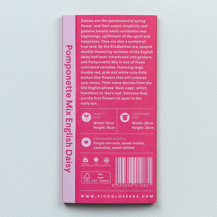 Daisies are the quintessential spring flower, and their sweet simplicity and genuine beauty easily symbolise new beginnings, upliftment of the spirit and happiness. They are also a symbol of true love. By the Elizabethan era, several double-flowering varieties of the English daisy had been introduced into gardens, and Pomponette Mix is one of those cultivated varieties, featuring large, double red, pink and white cute little button-like flowers that will colonise your lawns. Their name derives from the Old English phrase ‘Daes eage’, which translates to ‘day’s eye’, because they are the first flowers to open to the early sun.
