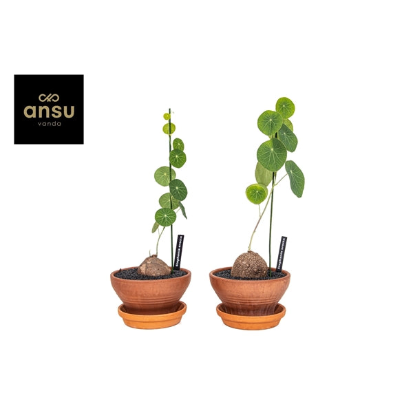Stephania erecta is a rare and collectable vining caudiciform plant. The bulb, or caudex looks kind of like a potato or beetroot that display a flush of parasol-shaped leaves along creeping vines.